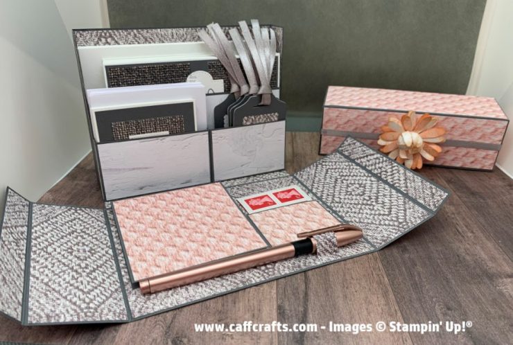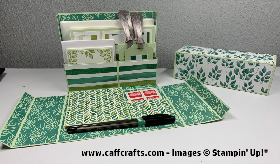 In part one, I show you how to make the base including the three pockets to hold greeting cards, little notelets and gift tags, I’ll also show you how to make a little notepad from scratch. In the tutorial I use the Forever Greenery designer series paper on Soft Sea Foam cardstock.